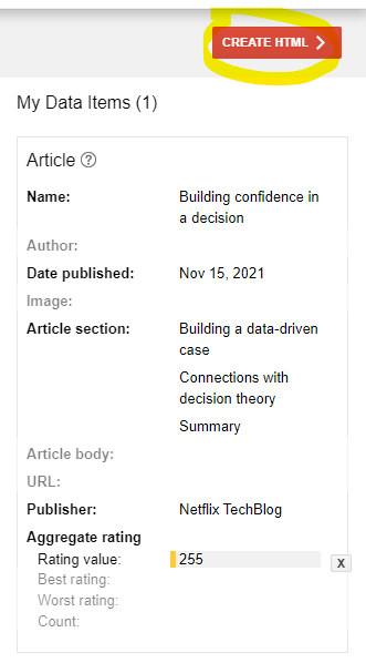 You’ll notice a box appear, containing a list of possible types. In this case we highlighted the name of the article, so we’ll click “Name”. Doing this updates the data item on the right-hand side: