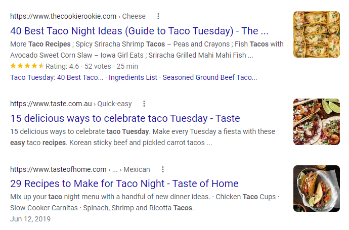 Here’s another example, this one for taco recipes. Thanks to schema markup, The Cookie Rookie is able to include a picture of the dish, its user rating, and even details like preparation time. The other two search results haven’t taken advantage of schema markups and have less information for the user to make a decision: