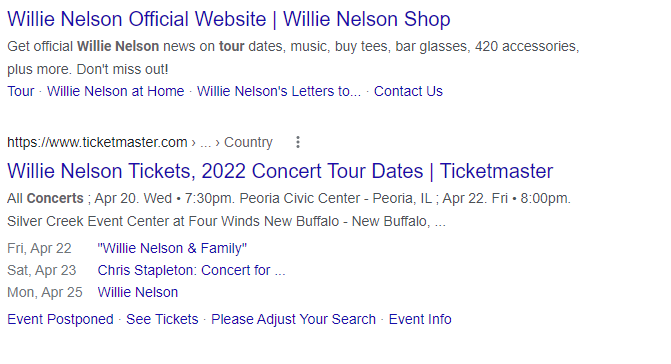Here’s an example of schema markup for a concert. Notice how, in addition to the normal title and description, this search engine result also includes a list of dates and locations for Willie Nelson concerts: