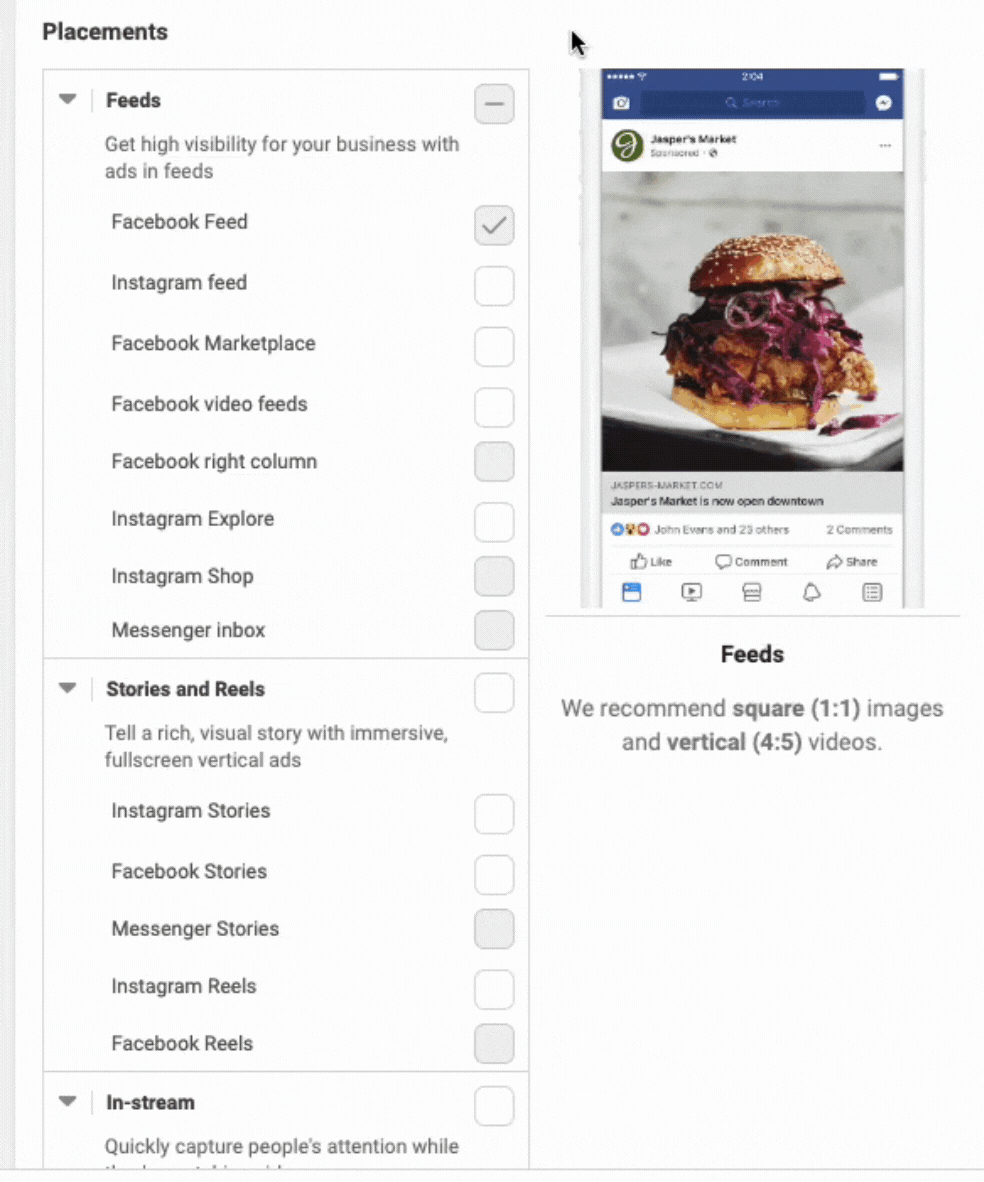 EXPERT TIP: If you’re just getting started, just focus on mobile Feeds & Stories. After you start seeing results you like, then you can test other ad placements.