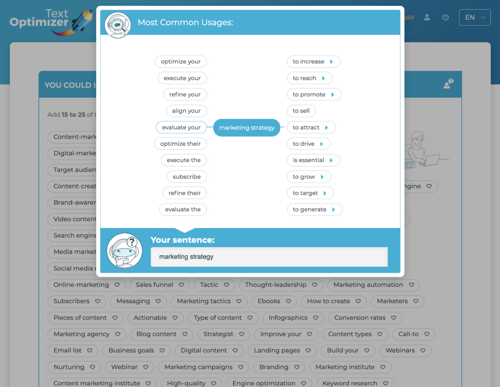 Text Optimizer is a semantic search analysis tool that helps you better understand your niche by giving you a list of concepts and entities that constitute it.