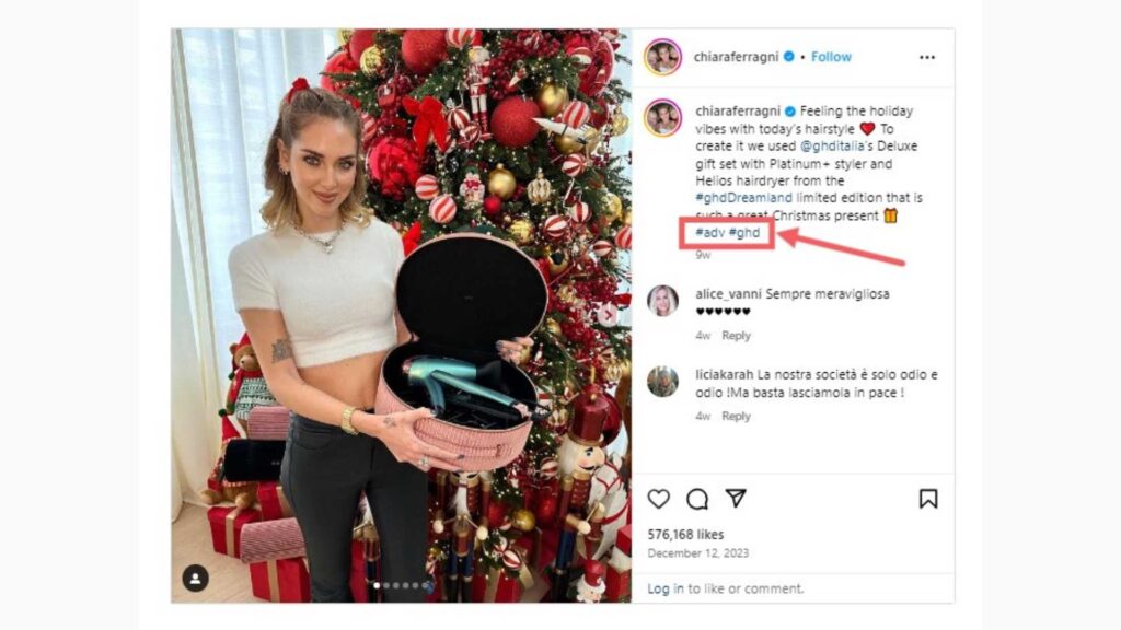 Additionally, look for influencers who use hashtags that are relevant to your campaigns. For instance, fashion influencer Chiara Ferragni uses #adv (advertising) and #ghd (good hair day) hashtags in this campaign.