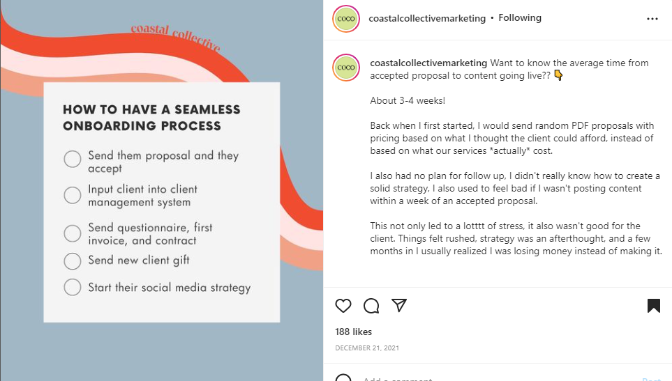 Coastalcollectivemarketing is a digital marketing agency. This brand sells various services to its clients. To make their audience engage with their brand on a personal level, they are sharing a back story on this post.