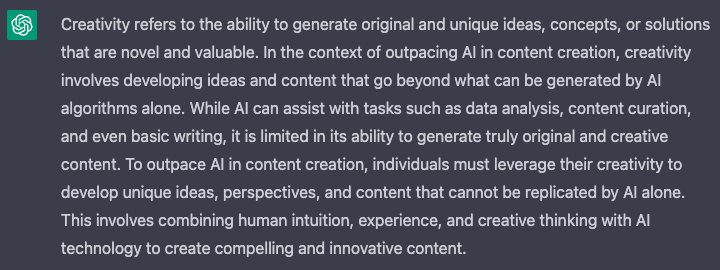 Now that you’re open to learning, let’s talk about creativity. Who better to show you how to beat AI in creativity, than AI? Here’s what ChatGPT had to say on the subject: