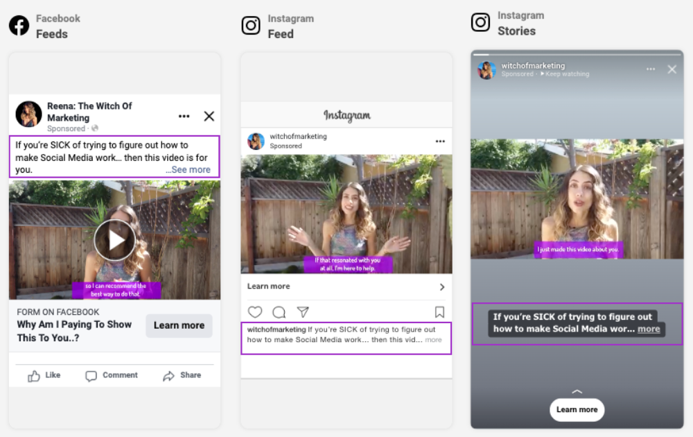On the Facebook News Feed, the primary text is above the button and video/image. On Instagram’s News Feed it’s below the button and image/video. And on Instagram Stories, it’s below the video but above the button. So if you’re directing someone on where to click, then make sure you navigate them appropriately by writing out “Click the button above” or “Click the ‘Learn More’ button below the video” based on your ad placement.