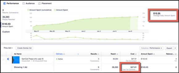 For example, the ad below is only being shown to people who have seen our SamCart sales page, have not bought, and who like Infusionsoft’s fan page.