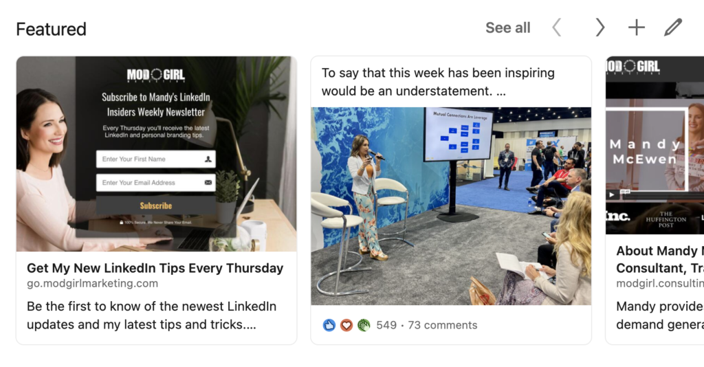 Adding featured media is one of the easiest ways to make your profile pop. You can include links to your website, case studies, videos, and your most popular LinkedIn posts.