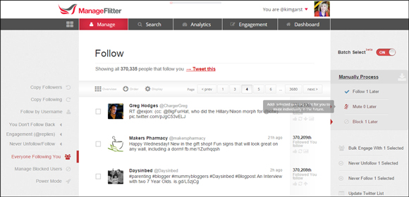 I spend more time tuning my Twitter machine using a great little tool called Manageflitter.