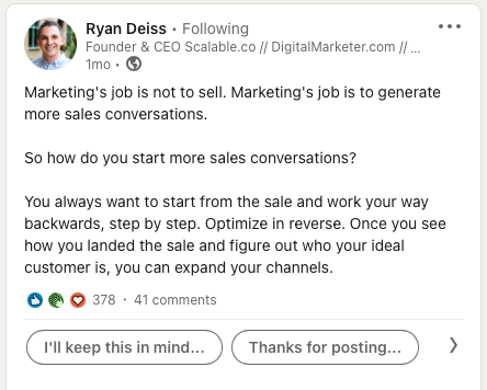 Part of becoming a LinkedIn B2B influencer requires you to engage your community. You need to actively engage with other people on the platform through comments on their posts, likes, shares, and DMs.