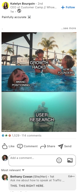 Bethany Cowan, Programming Manager at Clarion Events, and part of the epic team that helps us with our annual Traffic & Conversion Summit engages with the marketing community by commenting on a post by CEO of Customer Camp Katelyn Bourgoin: