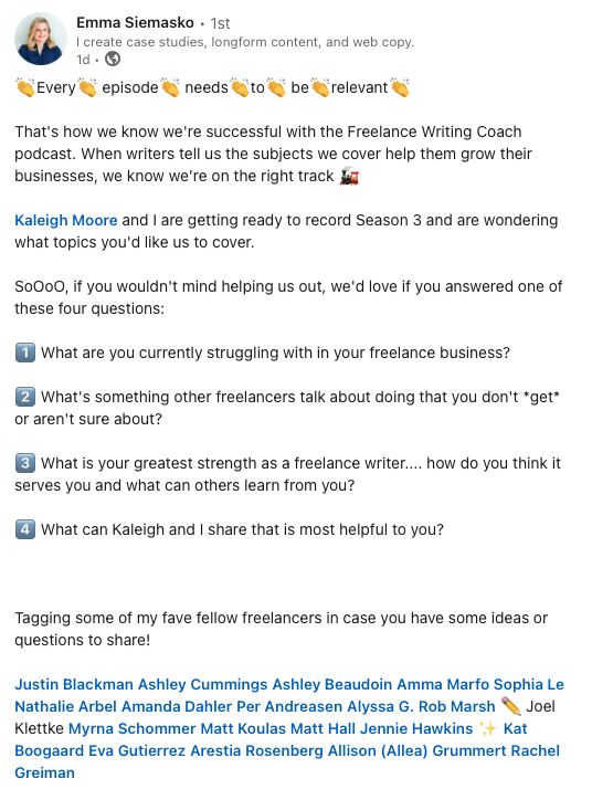 Emma Siemasko, founder and writer of Stories by Us, used her network of experts to 1) ask for feedback on her upcoming podcast episodes but 2) get more eyes on her post as each of those expert’s followers see that they were tagged in her post.