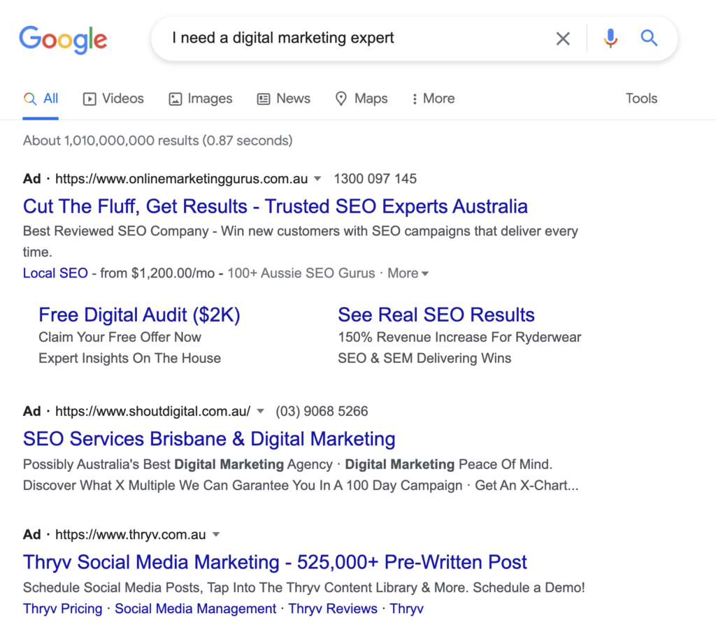 Alternatively, you can also run targeted Google Ads or YouTube Ads directly to your services. In this case, people will be seeing your ads pop up when they’re already searching for solutions to their problems, which you provide. This means you can be more direct by advertising your services on these platforms for specific keywords or phases as you’ll see below.